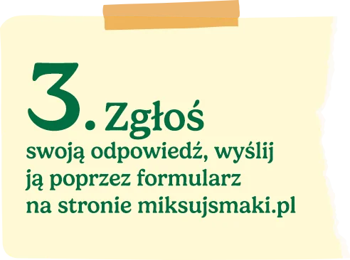 - Udział w Konkursie należy zgłosić przy pomocy formularza zgłoszeniowego w drodze rejestracji na stronie Konkursu www.miksujsmaki.pl W formularzu zgłoszeniowym należy wypełnić następujące obowiązkowe informacje i oświadczania oraz wykonać zadanie konkursowe: